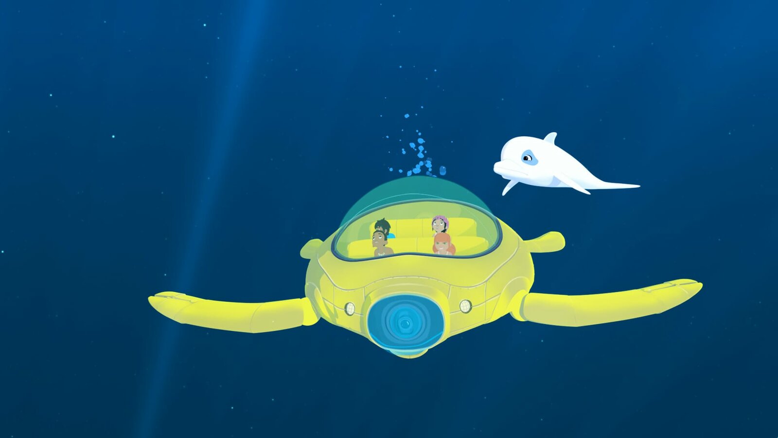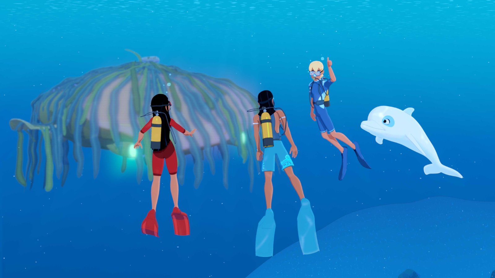 Phantom unter WasserTimeti, Auru, Yann und Zoom haben unter Wasser ein merkwürdiges Ding entdeckt. Ein Phantom unter Wasser?Bild: © ZDF und c Media Valley/Marzipan Films/TF1/Gaumont Animation - 2015