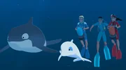 Mini-ZoomYann und Zoom haben einen Baby-Delfin und dessen Mutter entdeckt. Zoom ist begeistert über seine neuen Freunde, Yann dagegen ein wenig eifersüchtig.Bild: © ORF 1