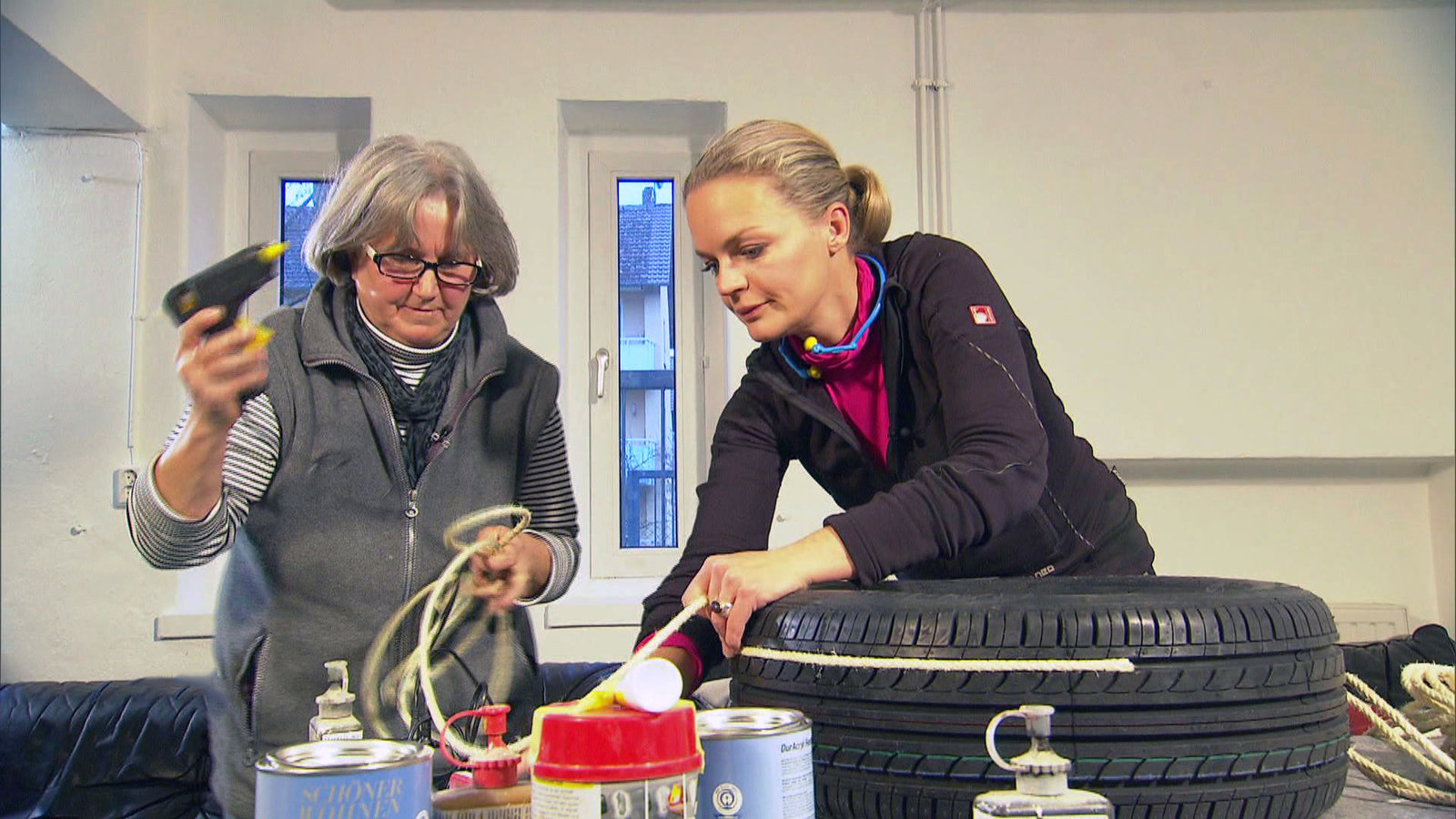 Diagnose Multiple SkleroseWie man aus einem alten Autoreifen einen Beistelltisch selbst machen kann zeigt Expertin Eva Brenner (re.) mit der tatkräftigen Unterstützung von Oma ErikaBild: © RTL II