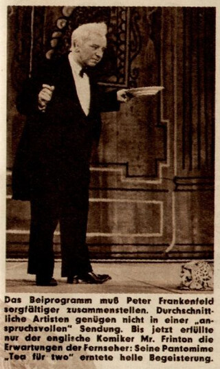 Ein entscheidendes Fundstück wurde uns nun bei tvforen.de genannt: Im Fernsehprogramm der Bravo-Ausgabe Nr. 4 aus dem Jahr 1961 wird - anlässlich der dritten Sendung von "Guten Abend!" - auf die ersten beiden Folgen zurückgeblickt, mit eher negativer Kritik: "Das Beiprogramm muß Peter Frankenfeld sorgfältiger zusammenstellen. Durchschnittliche Artisten genügen nicht in einer 'anspruchsvollen' Sendung. Bis jetzt erfüllte nur der englische Komiker Mr. Frinton die Erwartungen der Fernseher: Seine Pantomime 'Tea für two' erntete helle Begeisterung." Über dem Text ist ein Bild abgedruckt von Freddie Frinton als Butler; am Bildrand sieht man den legendären Tigerkopf. Vom NDR erhielten wir im Januar die Bestätigung, dass Frinton laut Produktionsprotokollen zwei Mal zu Gast war bei "Guten Abend!": am 22. Oktober 1960 und am 8. April 1961, d. h. in den Ausgaben 1 und 5. Das erwähnte Bild stammt demnach aus der ersten Ausgabe. Laut NDR geht aber leider weder aus den Produktionsprotokollen noch aus den Pressetexten zu den Sendungen hervor, welche Sketche aufgeführt wurden. Reicht der Tigerkopf als Beweis dafür aus, von einer Aufführung in der ersten Sendung auszugehen? Der Titel "Tea für two" [sic!] und die Beschreibung als "Pantomine" säen leider Zweifel.