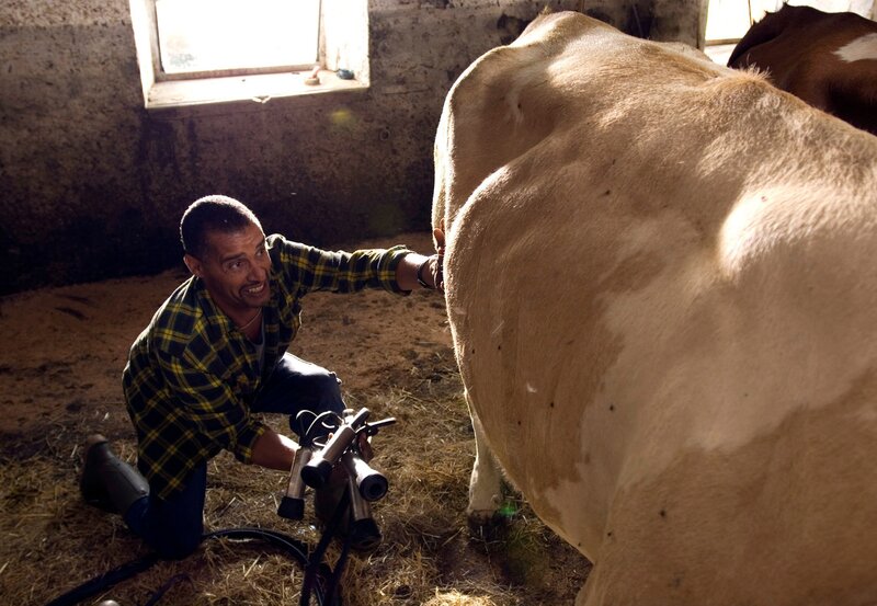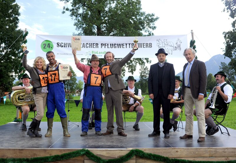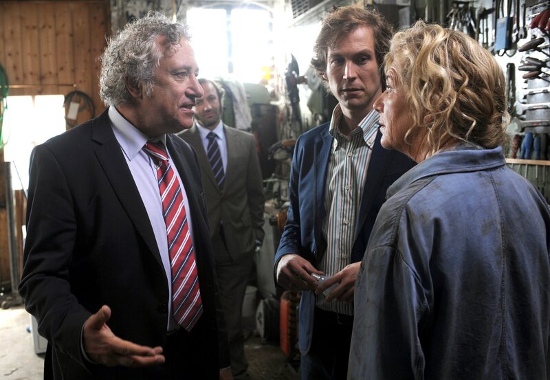 Pfarrer Ludwig (Gerhard Wittmann) und Bankberater Kurt (Robert Giggenbach, re.) zeichnen die lokalen Bauern aus, darunter auch das Team Elli (Jutta Speidel, re.) und Raymond (Christofer von Beau).