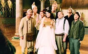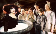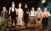 Die sieben Zwerge (v.r.: Martin Schneider, Boris Aljinovic, Norbert Heisterkamp, Ralf Schmitz, Gustav Peter Wöhler, Otto Waalkes, Mirco Nontschew) statten der Hexe (Nina Hagen, l.) einen Besuch ab. Wird sie ihnen den Namen des Unbekannten verraten?Bild: © ORF/TELEPOOL