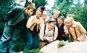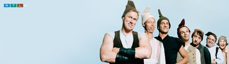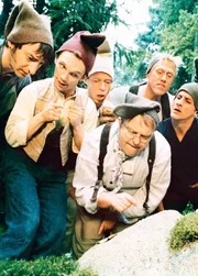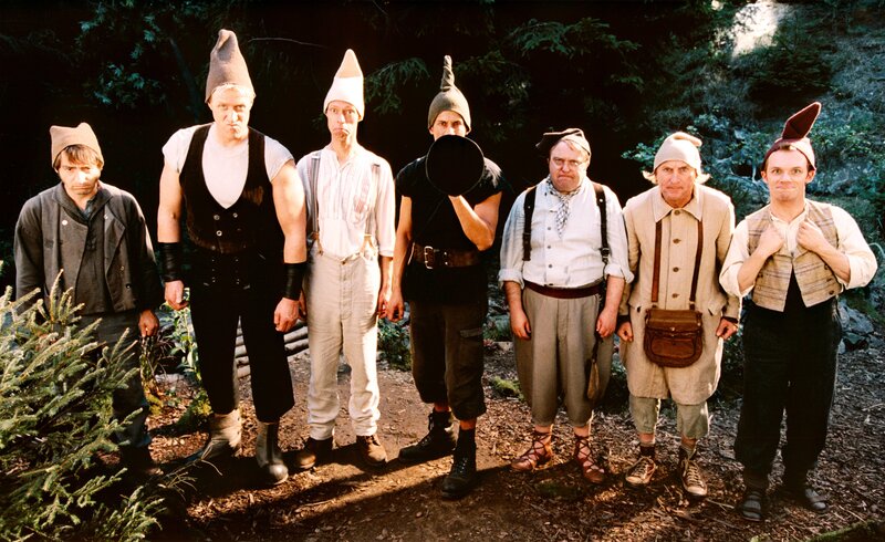 Schneewittchen (Cosma Shiva Hagen, M.) kann sich auf ihre sieben Zwerge (v.l.) Bubi (Otto Walkes), Speedy (Martin Schneider), Sunny (Ralf Schmitz), Ralfie (Norbert Heisterkamp), Cookie (Gustav Peter Wöhler), Tschakko (Mirco Nontschew) und Cloudy (Boris Aljinovic) verlassen!Bild: © ORF/Telepool