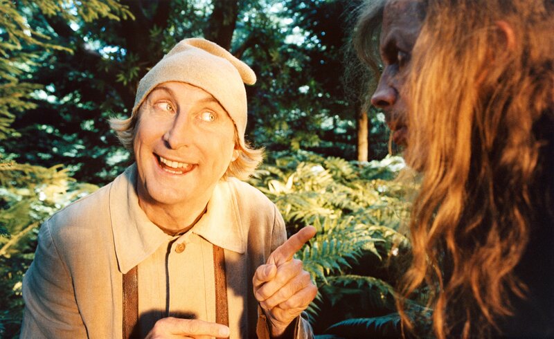 Nach dem er Hänsel und Gretel das Leben gerettet hat, trifft Bubi (Otto Waalkes) auf den Waldgeist (Axel Neumann, r.) und erfährt dabei auch dessen Namen: Rumpelstilzchen.Bild: © ORF/TELEPOOL