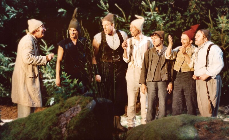 (v.l.) Bubi (Otto Waalkes) hat die sieben Zwerge (Mirco Nontschew, Norbert Heisterkamp, Martin Schneider, Boris Aljinovic, Ralf Schmitz, Gustav Peter Wöhler) wieder vereint, weil Schneewittchen ihre Hilfe braucht.Bild: © Super RTL