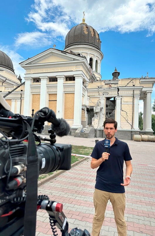 Die Dokumentation ist eine unterhaltsame und emotionale Zeitreise - vom Schwarz-Weiß-Fernsehen bis zum digitalen Zeitalter. Sie zeigt, warum der WDR als größter Sender der ARD weit mehr ist als ein Medienhaus: Er ist Teil des Alltags, der Kultur und der Identität in Nordrhein-Westfalen. - Vassili Golod, Leiter des WDR Studios in Kyiv. „Natürlich habe ich Angst, wenn die Drohnen kommen. Aber ist eben auch extrem wichtig, nach Deutschland zu berichten, was hier passiert.“ (Archivfoto: Liveschalte vor Verklärungskathedrale in Odessa)Bild: © WDR/Michael Wieseler