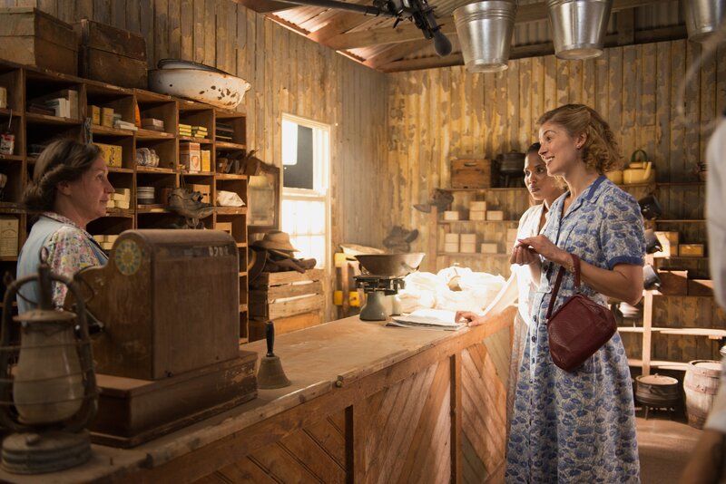 Ruth Williams (Rosamund Pike, r.) besucht mit Seratses Schwester Naledi (Terry Pheto, M.) einen Gemischtwarenladen im Dorf, deren Verkäuferin (Darstellerin unbekannt, l.) sich sehr reserviert gibt.Bild: © Stanislav Honzik / ZDF