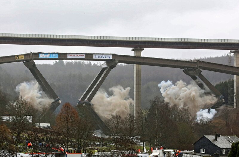 Ihren Spitznamen "Königin der Autobahnen" hatte die A45 direkt nach ihrer Einweihung 1971 weg: die besten Ausblicke, die schönste Strecke, und sechzig riesige Talbrücken. Heute sind sie alle kaputt. Zeit für die Rundumerneuerung: Die größte Baustelle, die meisten Brückensprengungen, die längsten Staus. Und für die Bewohner: der meiste Ärger. Trotzdem: es gibt wohl keine Region, die sich so sehr mit einer Autobahn identifiziert wie die Menschen hier im südlichen Westfalen. Denn erst mit dem Bau der Sauerlandlinie kam der Wohlstand in die Region und machte das Sieger- und Sauerland zum "powerhouse" im Wirtschaftsraum Nordrhein-Westfalen. - (Archivfoto: Die Talbrücke Rinsdorf auf der Autobahn A45 zwischen den Anschlussstellen Siegen Süd und Wilnsdorf wird gesprengt. Daneben steht ein Teil des neuen Brückensystems. 120 Kilogramm Sprengstoff haben die 500 Meter lange und 70 Meter hohe Talbrücke der Autobahn 45 erfolgreich zu Fall gebracht)Bild: © WDR/ picture alliance/dpa