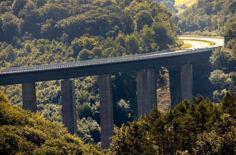 Ihren Spitznamen "Königin der Autobahnen" hatte die A45 direkt nach ihrer Einweihung 1971 weg: die besten Ausblicke, die schönste Strecke, und sechzig riesige Talbrücken. Heute sind sie alle kaputt. Zeit für die Rundumerneuerung: Die größte Baustelle, die meisten Brückensprengungen, die längsten Staus. Und für die Bewohner: der meiste Ärger. Trotzdem: es gibt wohl keine Region, die sich so sehr mit einer Autobahn identifiziert wie die Menschen hier im südlichen Westfalen. Denn erst mit dem Bau der Sauerlandlinie kam der Wohlstand in die Region und machte das Sieger- und Sauerland zum "powerhouse" im Wirtschaftsraum Nordrhein-Westfalen. - (Archivfoto: 11.08.2022, Nordrhein-Westfalen, Lüdenscheid: Blick auf die gesperrte Talbrücke Rahmede. Für die geplante Sprengung der maroden Rahmede-Talbrücke an der Sauerlandlinie A45 ist das Vergabeverfahren laut Bundesverkehrsministerium abgeschlossen.)Bild: © Dieter Menne