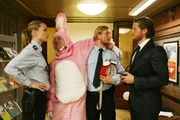 Als der Chef des Planungsbüros der Polizei, Dr. Linsenhof (Prodromos Antoniadis, l.), mit dem geläuterten Kersten (Sebastian Ströbel, r.) im Polizeirevier auftaucht, müssen Carla und ihre Kollegen ein Schmunzeln unterdrücken. Denn Linsenhof ist der rosa Hase, der ihnen am gestrigen Rosenmontag das Leben schwer machte ...