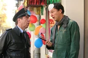 Der Karneval ist voll im Gange, die ersten Schnapsleichen werden aufgegriffen. Da bekommt Aishe (Pinar Erincin, r.) den riesigen Törtchen (Norbert Heisterkamp, l.) übergeben, während der Betriebsprüfer Kersten jeden ihrer Schritte dokumentiert ...