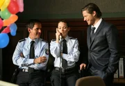 Ausgerechnet am Rosenmontag wird Carlas (Lisa Maria Potthoff, M.) und Ricks (Christoph Maria Herbst, l.) Revier einer Betriebsprüfung unterzogen. Und die kann nur schiefgehen, weil der plötzlich im Revier auftauchende Prüfer ausschließlich Gründe finden will, den Laden dichtzumachen - und dieser sehr attraktive Mann Joachim Kersten (Sebastian Ströbel, r.) heißt und einmal die große Liebe in Carlas Leben war, bevor sie sich in Rick verliebte ...