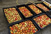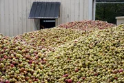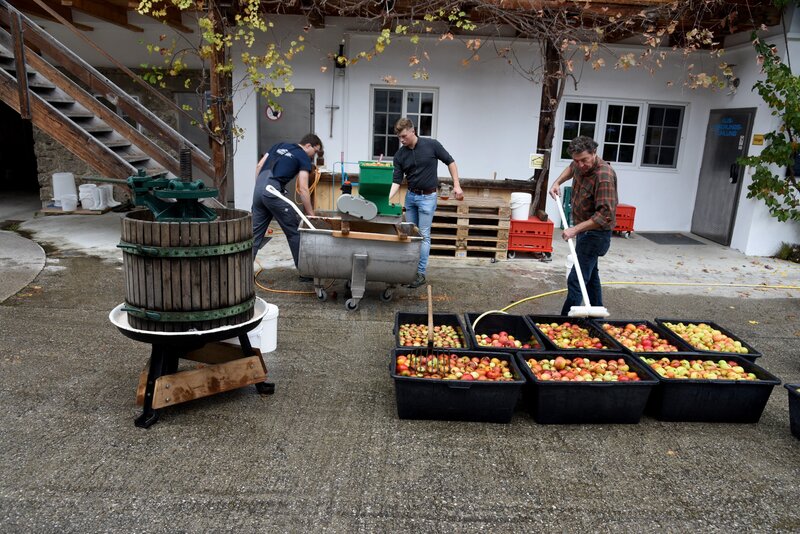 Beim Anderlbauer in Frasdorf werden die geernteten Äpfel in Kästen gesammelt, bevor sie anschließend mit der alten Apfelsaftpresse zu Apfelsaft weiterverarbeitet werden.Bild: © ORF/Produktion West/Gerhard Mader