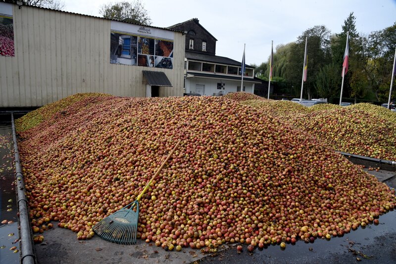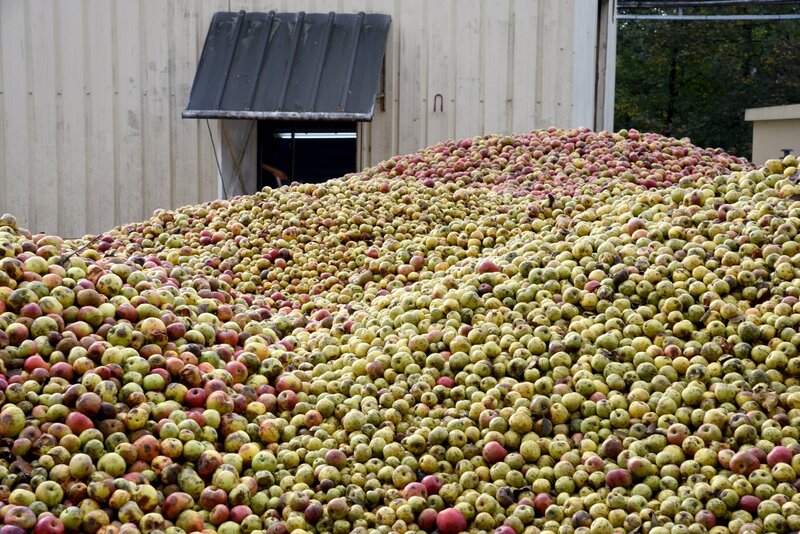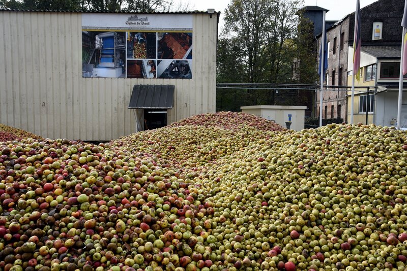 Nach der Ernte werden die Äpfel der Brennerei Château du Breuil in der Normandie im Innenhof auf großen Haufen gesammelt, bevor sie zu Calvados weiterverarbeitet werden.Bild: © ORF/Produktion West/Gerhard Mader