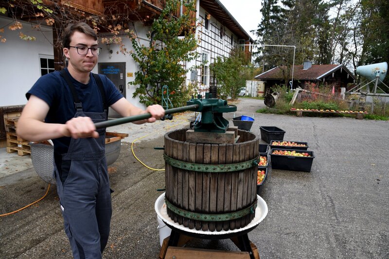 Beim Anderlbauer ist man stolz auf die alte Apfelsaftpresse, die immer noch mit Hand betrieben wird und kräftige Hände abverlangt.Bild: © ORF/Produktion West/Gerhard Mader