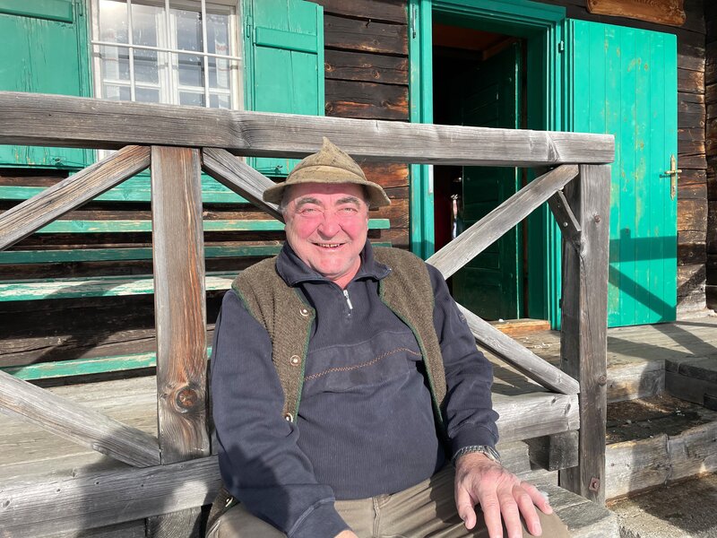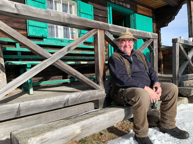 Ludwig Kammerhofer Urenkel von Büchsenmacher Rosi vor Almhütte.Bild: © ORF / Udo Maurer