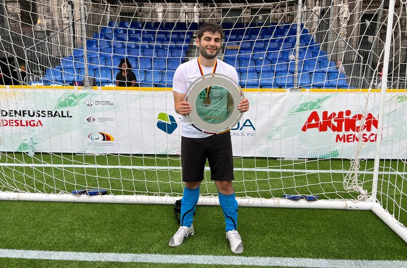 Ali Can Pektas hat mit seinem Verein SF BG Blista Marburg 2023 die Deutsche Meisterschaft im Blindenfußball gewonnen.Bild: © HR/Tobias Weiler