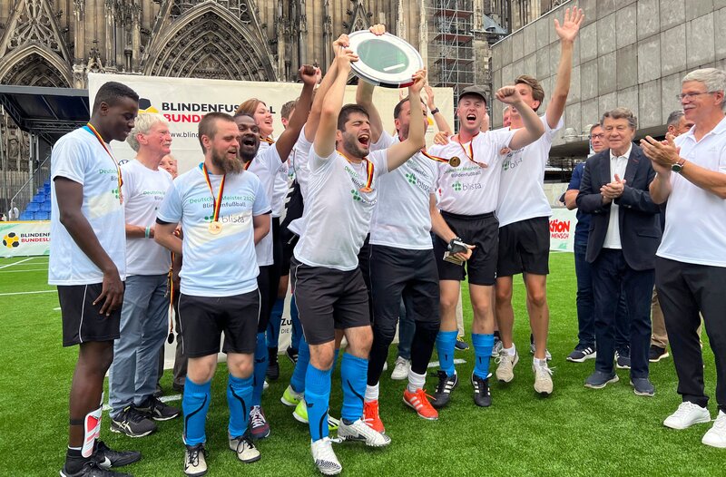 Ali Can Pektas (Mitte, hält die DFB-Meisterplakette hoch) im Kreise seiner Mannschaft SF BG Blista Marburg nach dem Gewinn der Deutsche Meisterschaft im Blindenfußball 2023. Die offizielle DFB-Meisterplakette wurde von Trainer-Legende Otto Rehagel (2.v.r.) überreicht.Bild: © HR/Tobias Weiler