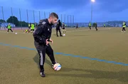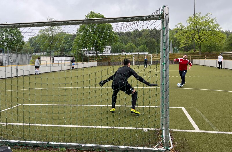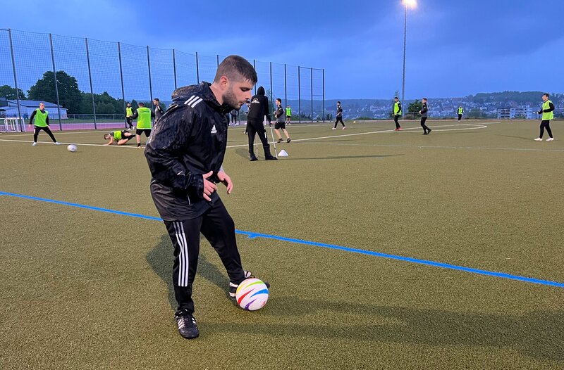 Ali Can Pektas beim Training. Im Ball sind Rasseln, denn beim Blindenfußball kommt es aufs Hören an. Durch das Geräusch der Rasseln weiß der Blindenfußballer wo der Ball gerade über das Spielfeld rollt.Bild: © HR/Tobias Weiler