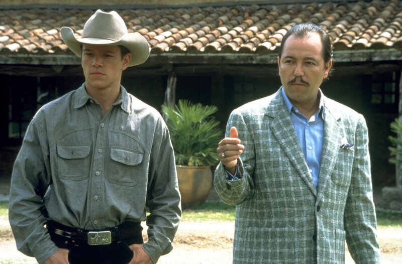 Der mexikanische Pferdebaron Hector de la Rocha (Rubén Blades, re.) bemerkt schnell, dass John Grady Cole (Matt Damon, li.) etwas von Pferden versteht.