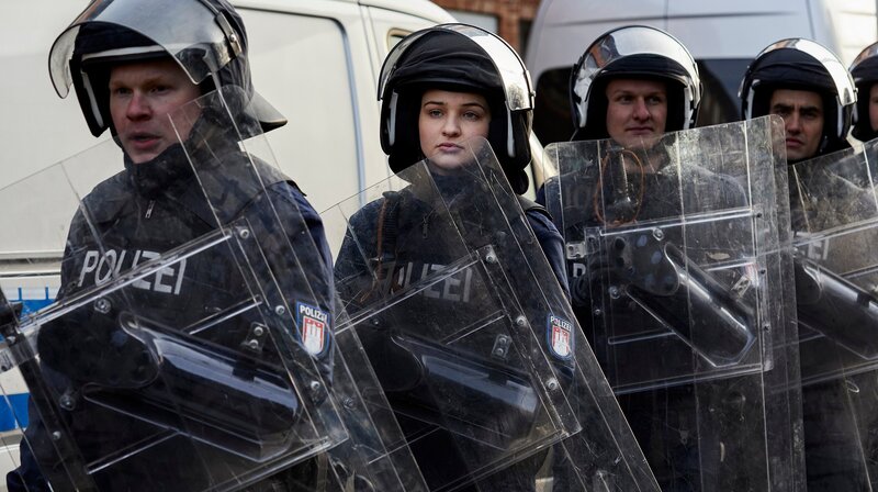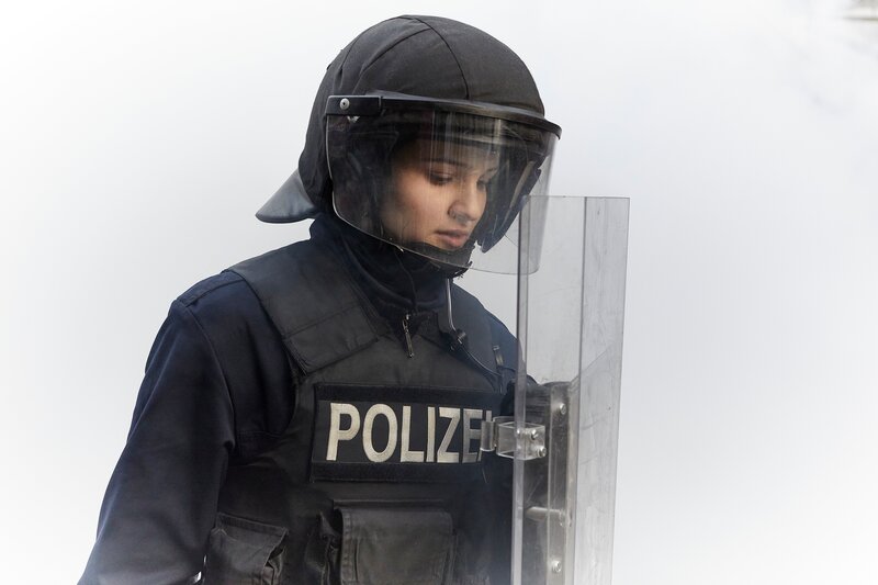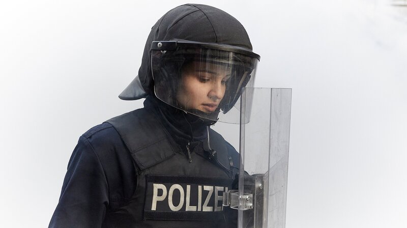 Laura (Lisa Vicarii) in Uniform auf Demo.Bild: © NDR, Alena Sternberg, klinkerfil / ZDF