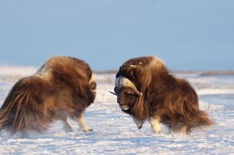 Moschusochsen beim Kampf. +++ Die Verwendung des sendungsbezogenen Materials ist nur mit dem Hinweis und Verlinkung auf RTL+ gestattet. +++Bild: © RTL / Tom Campion Foundation/ Terra Mater Factual Studios GmbH / Florian Schulz