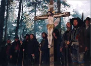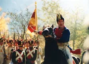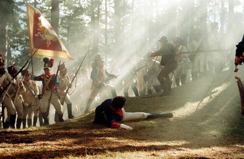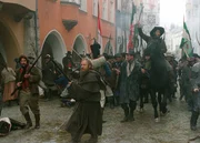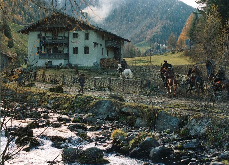 Pater Joachim Haspinger (Franz Xaver Kroetz, vorne) und Andreas Hofer (Tobias Moretti, rechts, reitend) führen die aufständischen Bauern in der Schlacht um Innsbruck an.