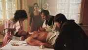 Lisa Schumacher, Tochter des Innsbrucker Bürgermeisters, (Dorothee Hartinger, links), ein Chirurg und Jakob (Lukas Zolger, rechts) kümmern sich um den verletzten bayerischen Oberst Karl Philipp von Wrede (Heio von Stetten, Mitte). Der Innsbrucker Bürgermeister Kasimir Schumacher (Toni Böhm, hinten rechts) und seine Frau Lisa (Katharina Welser, hinten links) beobachten die Szene besorgt.