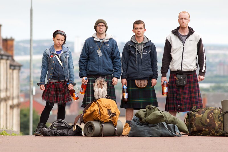 Robbie (Paul Brannigan, 2. von rechts) plant, sich einen Teil des teuren Whiskys abzuzweigen, um sich damit eine sorgenfreie Zukunft zu ermöglichen. Er reist mit Mo (Jasmin Riggings, links), Albert (Gary Maitland, 2. von links) und Rhino (William Ruane) daraufhin per Anhalter in den Norden Schottlands zur Destillerie Balblair, auf deren Gelände das Fass gelagert wird und in der auch die Versteigerung stattfinden soll.