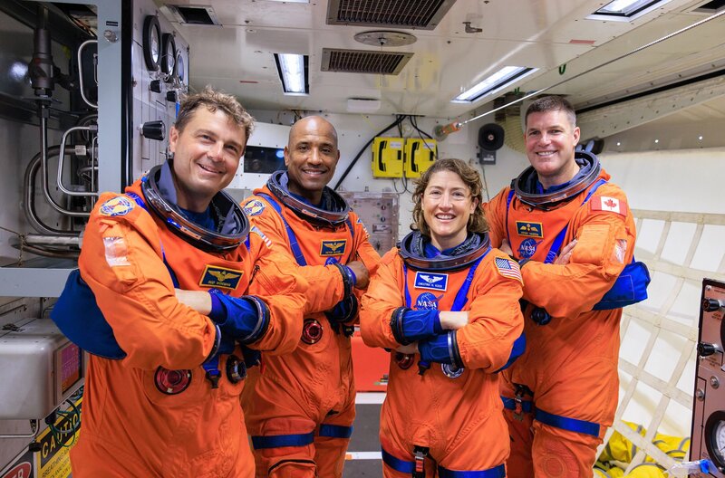 Die Besatzung von Artemis II: NASA-Astronauten Christina Koch (2.v.r.), Victor Glover (2.v.l.), Reid Wiseman (li.) und der kanadische Astronaut Jeremy Hansen (re.)
