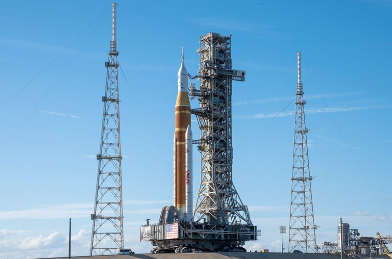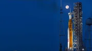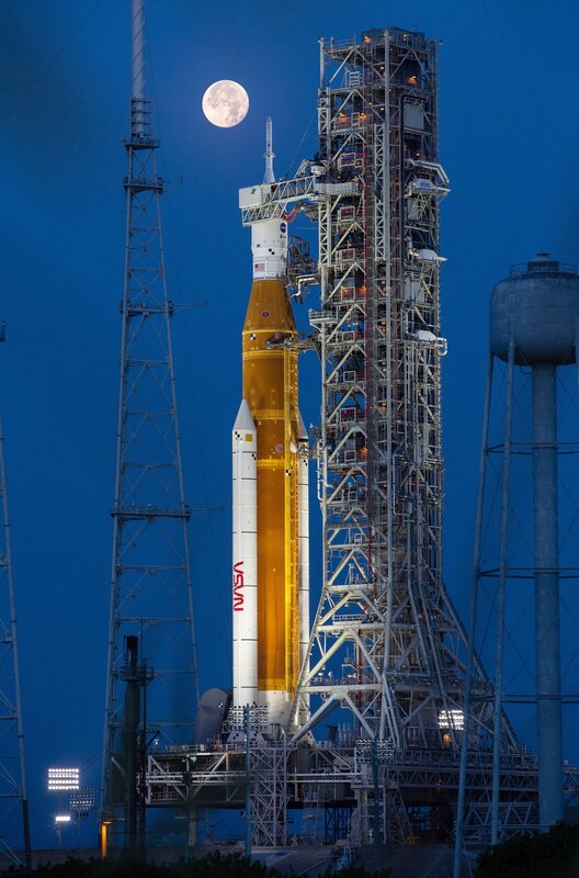 Vollmond über dem Startkomplex 39B des Kennedy Space Center der NASA in Florida: SLS Artemis I und Orion auf der mobilen Startplattform für die Generalprobe