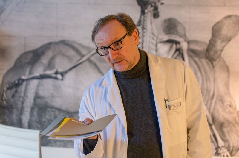Dr. Sebastian Hofer (Rainer Bock) klärt seinen Patienten über den von ihm betreuten Sterbevorgang auf.Bild: © ORF