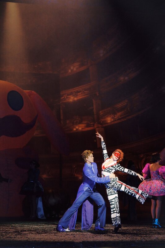 Ruth Brauer-Kvam (Miss Alice / Madame Francine), Lionel von Lawrence (Danny Robinson), Johanna Arrouas (BirdyLove/Fanchon), Jakob Semotan (Manager Stefan/Josef Stanzel), Ensemble.Bild: © ORF/Volksoper/Marco Sommer