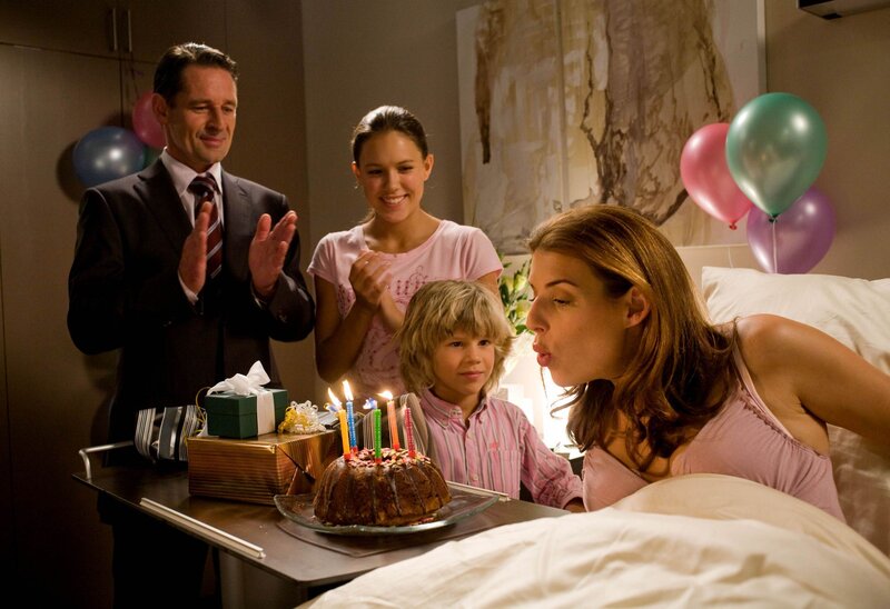Erst sehr spät erkennt Max Burghardt (Max Tidof, l.), dass er seine Frau (Elena Uhlig, r.) und seine Kinder (Filippo Kreindl, 2.v.r. und Carina Diesing, 2.v.l.) über alles liebt und niemals verlieren möchte. Doch da erfährt er, dass seine Frau beim Schulfest eine wichtige Entscheidung kundtun möchte ...