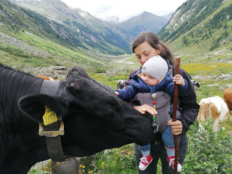 Für die junge Südtirolerin, die jedes Jahr den Sommer auf einer hoch gelegenen Alm im österreichischen Pinzgau verbringt, ist es dieses Jahr etwas abenteuerlich: Erstmals muss sie den kleinen Freddy mit den Tieren unter einen Hut bringen. Wenn sie die Jungrinder auf eine andere Weide treibt, nimmt sie den Kleinen mit. An seinem ersten Viehtrieb scheint Freddy Gefallen gefunden zu haben.Bild: © Brigitte Kornberger / BR