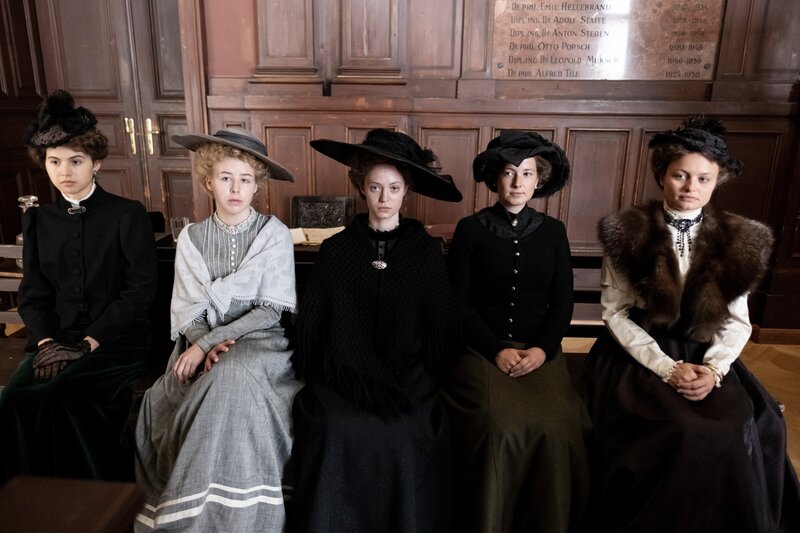 Marie Pokorny (r., Gina Christof), Marie Winkler (3.v.r., Fanny Altenburger) und Anna Christ (4.v.r., Julia Wozek) wurden im Riehl-Bordell ausgebeutet, sind nun aber wegen Falschaussage angeklagt.