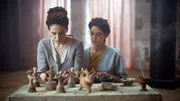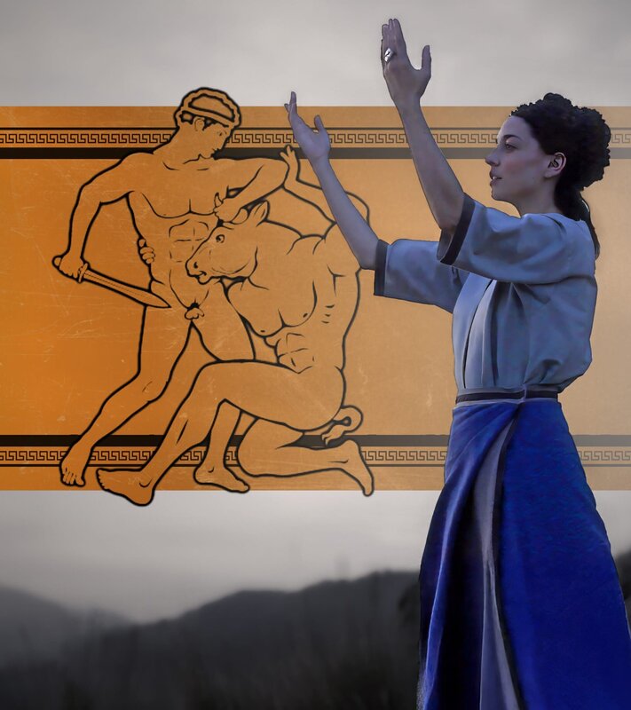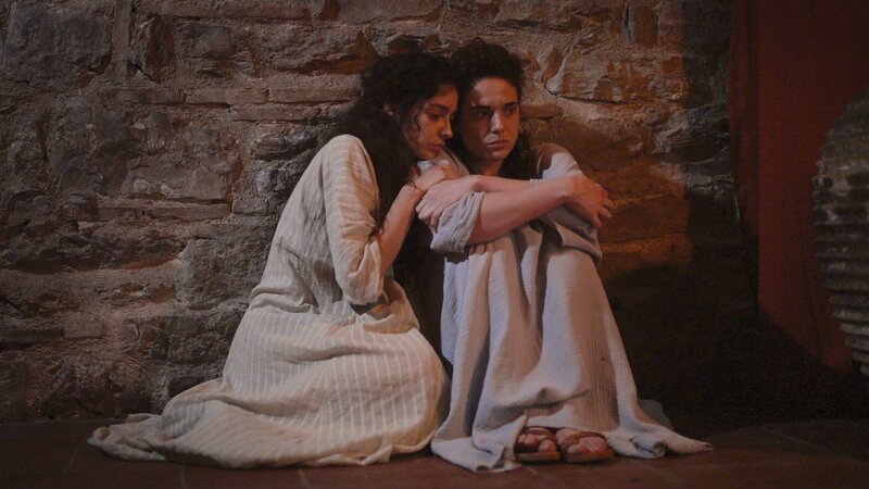 Pimanara (Sofia Kikilintzi) und Sijama (Rania Athanasopoulou) vollziehen ein Ritual zu Ehren der Göttinnen. Die minoische Religion umfasste die Verehrung von Naturgottheiten, die Durchführung von Ritualen sowie die Darbringung von Opfergaben wie Lehmfiguren und Feldfrüchten.Bild: © Harald Staudach / EPO-Film / ZDF