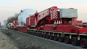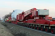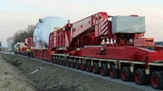 Bildunterschrift: In Westfalen kämpft eine Schwertlastspedition mit dem Gewicht und der Höhe des Transportguts. Auf einem herkömmlichen Tieflader wäre das knapp 200 Tonnen schwere Getriebe mit fünf Metern zu hoch für die Brücken auf dem Weg in den Verladehafen.; Bildunterschrift: In Westfalen kämpft eine Schwertlastspedition mit dem Gewicht und der Höhe des Transportguts. Auf einem herkömmlichen Tieflader wäre das knapp 200 Tonnen schwere Getriebe mit fünf Metern zu hoch für die Brücken auf dem Weg in den Verladehafen.