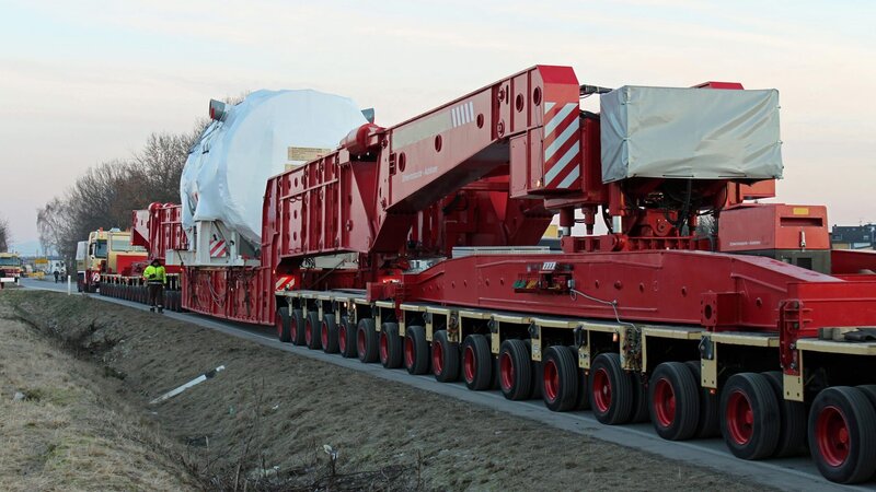 In Westfalen kämpft eine Schwertlastspedition mit dem Gewicht und der Höhe des Transportguts. Auf einem herkömmlichen Tieflader wäre das knapp 200 Tonnen schwere Getriebe mit fünf Metern zu hoch für die Brücken auf dem Weg in den Verladehafen.