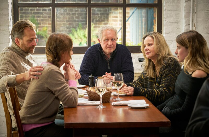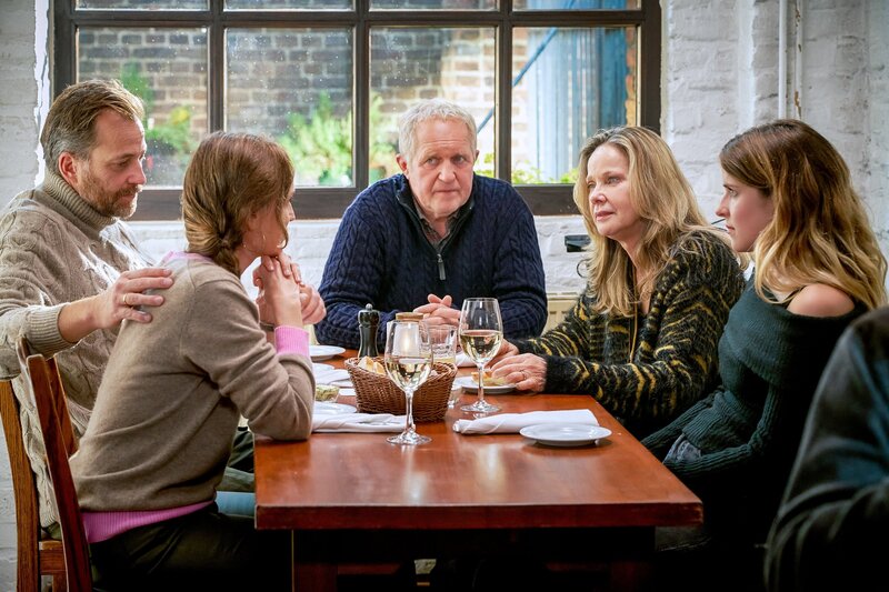 Paul (Christian Erdmann, li.), Stefan (Harald Krassnitzer, 3.v.li.), Sabine (Ann-Kathrin Kramer, 2.v.re.) und Annika (Leonie Brill, re.) sitzen zusammen mit Anna (Julia Koch, 2.v.li.) bei Tisch, sie erzählt von der Schule, was Sabine schwer aushält.
