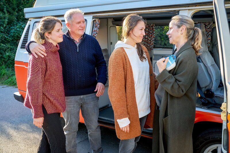 Stefan (Harald Krassnitzer) und Sabine (Ann-Kathrin Kramer, re.) verabschieden sich von Annika (Leonie Brill, li.) und Iryna (Irina Potapenko, 2.v.re.) auf ihre große Reise.