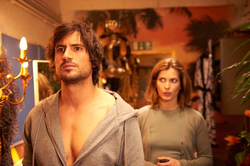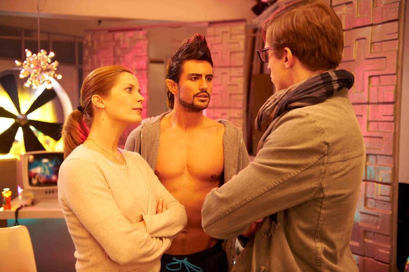 Um die Schauspielkunst der Pornodarsteller etwas zu verbessern, engagiert Marie den jungen Dramaturgen Marek (Golo Euler, r.). Doch seine Arroganz kommt weder bei den Pornostars (Leander Lichti, l.) noch bei Marie gut an ...