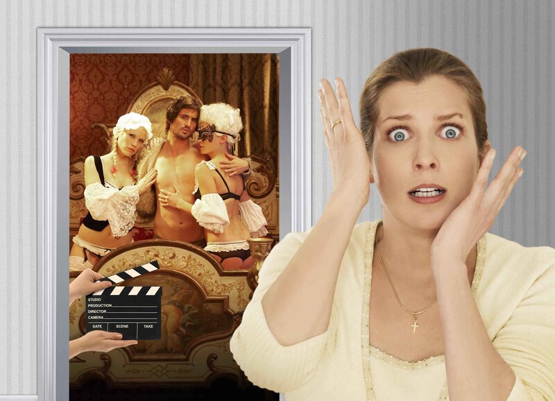 Nach dem Unfalltod ihres Mannes erbt Marie (Valerie Niehaus, r.) statt eines erfolgreichen Internetunternehmens eine Pornoproduktionsfirma. Für deren Gründung hatte sich ihr Mann von dem prüden Arztehepaar Elke (Lilly Forgach, l.) und Hubert (Christoph Gareisen, M.) 100.000 Euro geliehen. Jetzt muss Marie verhindern, dass die Nachbarn erfahren, wo ihr Geld gelandet ist ...