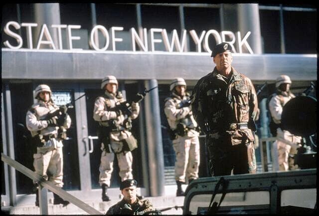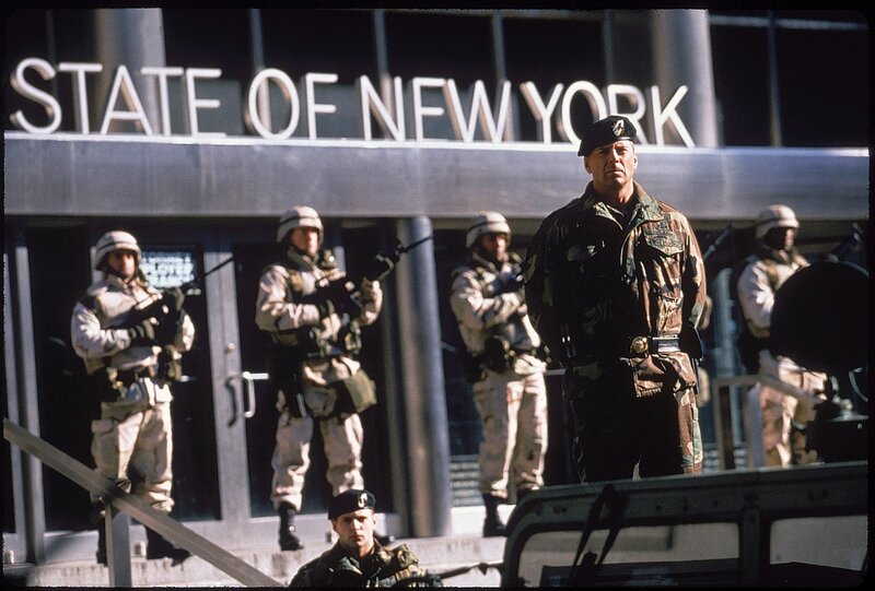 Unter dem tyrannischen General William Devereaux (Bruce Willis, vorne) wird in New York der Ausnahmezustand ausgerufen und somit den Terroristen unfreiwillig in die Hand gespielt ...