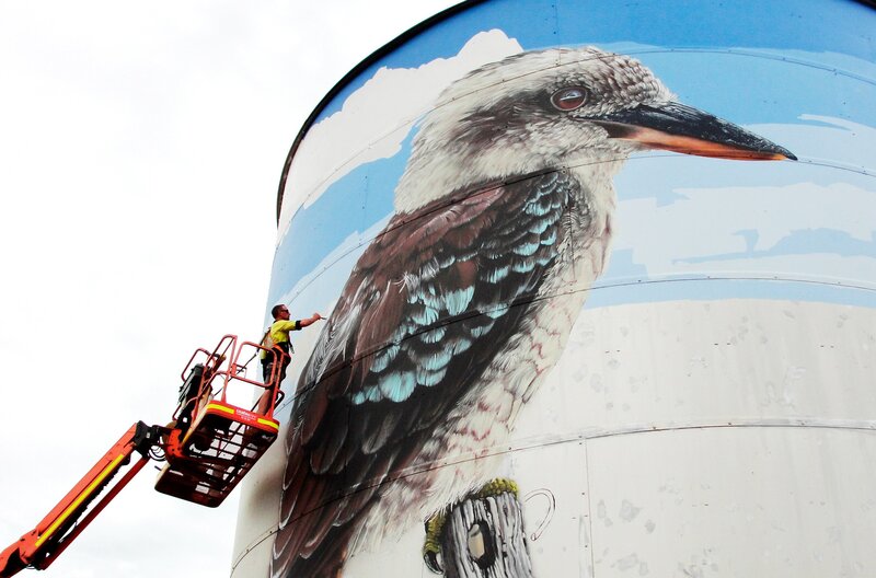 Nachdem der Kookaburra fertig ist, malt der Künstler Geoffrey Carran den Himmel. Er soll mit dem echten Himmel hinter den Silos verschmelzen.Bild: © MedienKontor/Geoffrey Carran / © MedienKontor/Geoffrey Carran