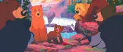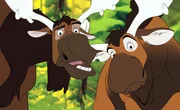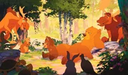Neben dem gelangweilten Kenai (Mi.re.) erzählt Koda (Mi.li.) den Tieres des Waldes von seinen Erlebnissen mit den Elchen.Bild: © Disney Channel
