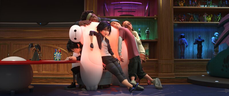 Der Verlust stürzt Hiro in eine tiefe Krise. Das triggert Baymax, der ihm zur Seite stehen will. Zusammen mit Baymax werden auch Hiros Mikroroboter wieder aktiv. Ein Bösewicht hat sie geklaut und setzt die Technologie ein, um seinen kriminellen Machenschaften nachzugehen. Hiro bleibt nichts anderes übrig, als sich mit den Nerds von der Uni zusammenzuschliessen, um den Schurken zu bekämpfen. Sie bauen sich selber um - zu Superheldenrobotern.