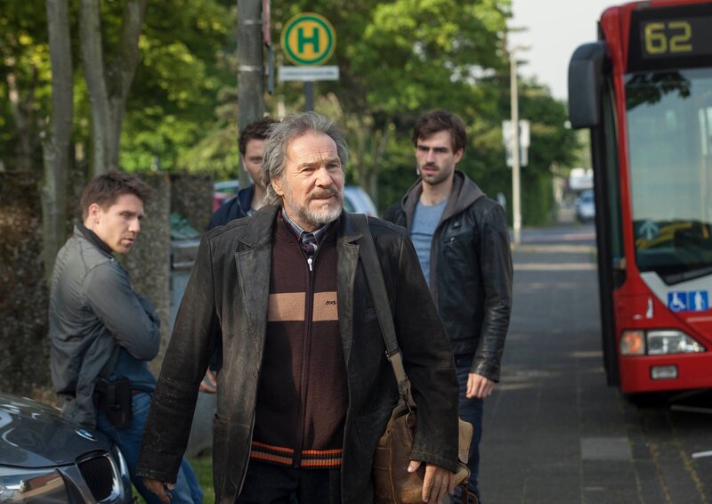 Nach seiner Haftentlassung wird der als gefährlich geltende Joseph Komalschek (Götz George, Mitte) von dem Polizisten Tom Barner (Hanno Koffler, li.) und seinem Kollegen Rudi (Moritz Vierboom) überwacht.