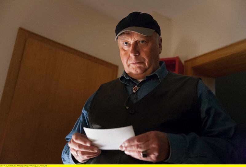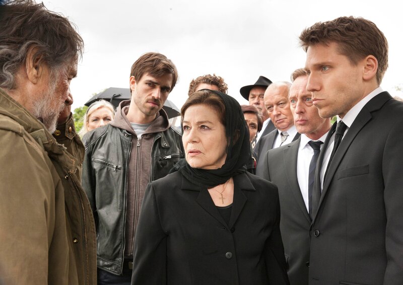 Agnes Barner (Hannelore Elsner) und ihr Sohn Tom (Hanno Koffler, re.) sind nicht erfreut, dass sie auf einer Beerdingung den entlassenen Sträfling Joseph Komalschek (Götz George, li.) antreffen. Ebenso wenig erfreut sind Polizeirat Scherler (Wilfried Hochholdinger, 2. v. re.), Heinz Braun (Thomas Thieme, 3. v. re.), Friz Reet (Hans-Martin Stier, 4. v. re.) und der Polizist Rudi (Moritz Vierboom, 2. v. li.).