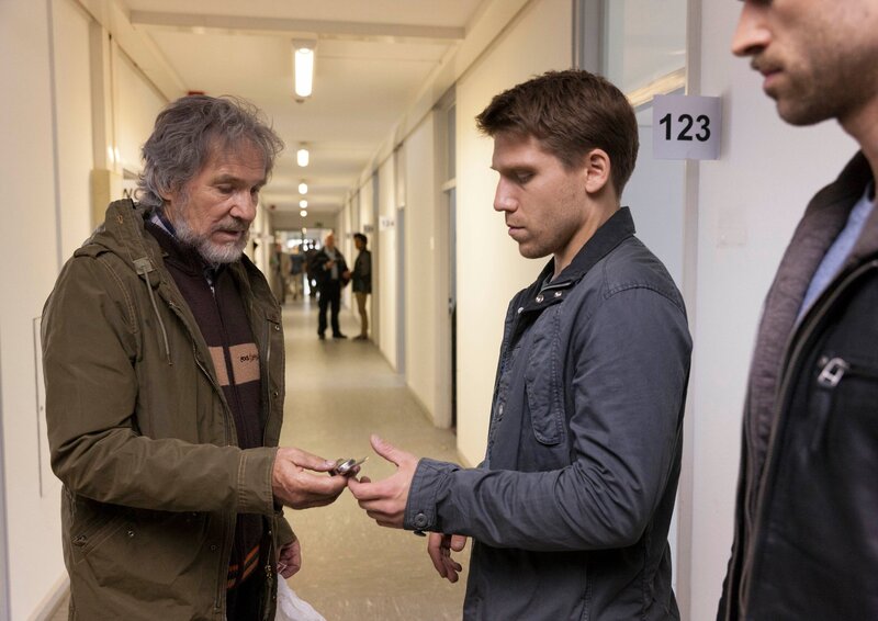 Joseph Komalschek (Götz George) wird bei einem Besuch auf dem Arbeitsamt durchsucht und muss sein Messer an die Polizisten Tom Barner (Hanno Koffler, Mitte) und Rudi (Moritz Vierboom) abgeben.
